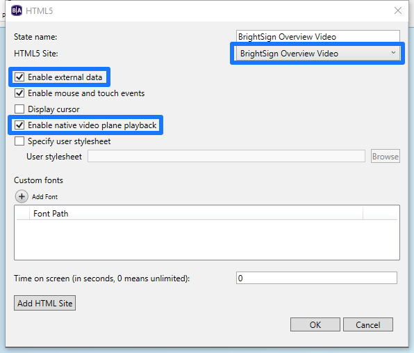 14 . A continuación, añada un Estado HTML5 con las opciones Habilitar datos externos y Habilitar reproducción nativa del plano de vídeo marcadas.